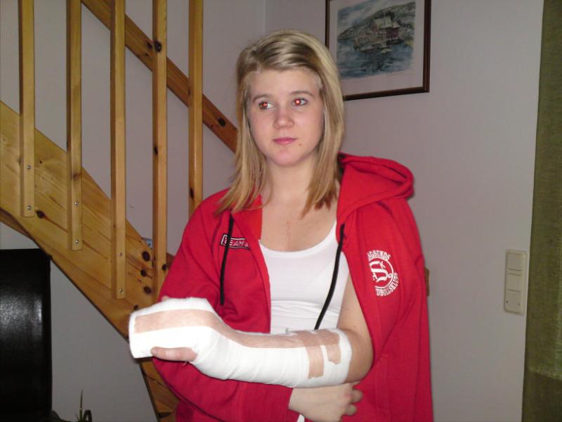 Pekfingret var ur led men inget var brutet och inga senor var skadade. Däremot ska fingret nu vara helt stilla i en vecka och därför är yngsta dotterna gipsad upp till armbågen. Efter det ska hon tillbaka till läkaren och förhoppningsvis räcker det med att sedan vara tejpad i ett par veckor.