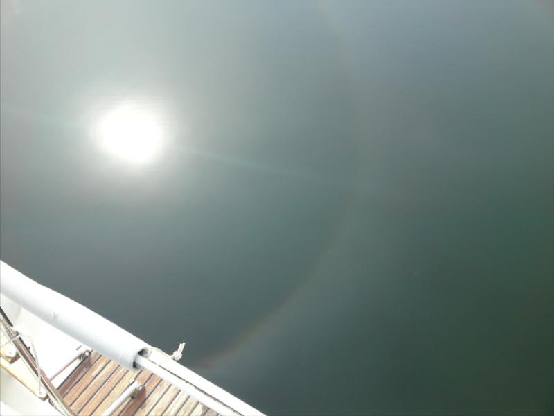 Vi har kommit ut till båten och kunnat konstatera att det skulle vara svårt att segla just nu. Det är helt vindstilla! Och runt solen är det en mycket tydlig halo. Konstigt, det brukar ju betyda sämre väder och det har de ju inte pratat om. Det får bli en kopp kaffe i sittbrunnen innan jag börjar städa nere i båten. Där är det kallt och det märks att havet med sina 8 grader kyler bra.