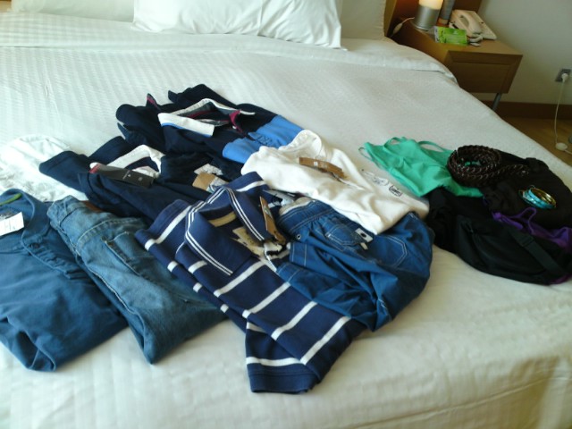 Redan vid frukosten nämnde han att han nog behövde ett par t-shirts (han hade räknat fel på dagar vi skulle vara här). Och ja, det blev några t-shirts och en hel del till… Det är hans kläder till vänster i bild.