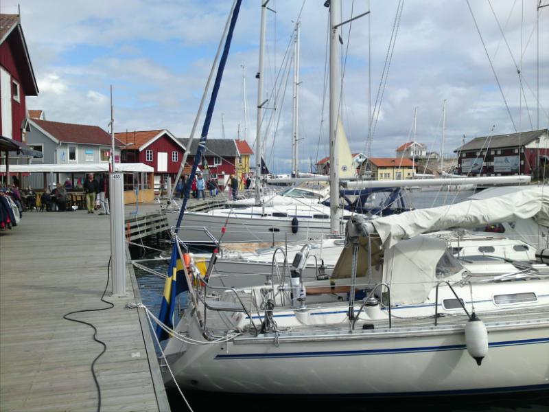 På somrarna är här knöfullt men inte nu. Det är Smögen det handlar om. Hade inte kompisbåten legat här när vi kom hade det varit svårt att välja plats. På väg hit fick vi en hel del regn på oss men sedan vi kom fram har vi klarat oss. Nu skiner solen trots svarta moln runt om oss. Juniorgastarna håller på och fixar sig och tänker sig en tur iland. Vi lite äldre stannar i båten och öppnar en flaska Prosecco.