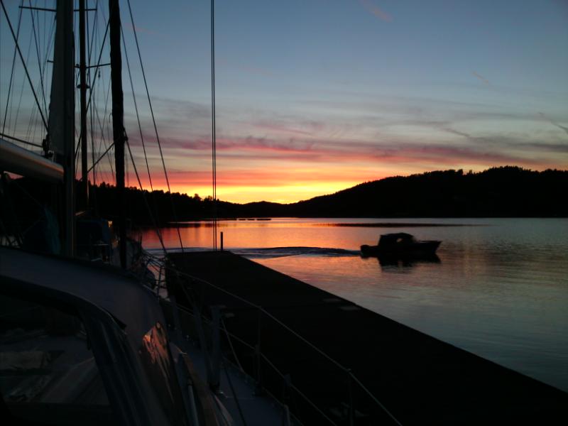 Fredagen har övergått i lördag och det har blivit dags att gå och sova. Båten har tre kabiner så vi har varsin sovkompis. Kvällen var mycket trevlig, något som en av våra makar nog misstänkte. Han kom nämligen förbi. Gissa vem? Nu ser vi fram emot vackert väder när vi vaknar. Frukost i sittbrunnen är aldrig fel.