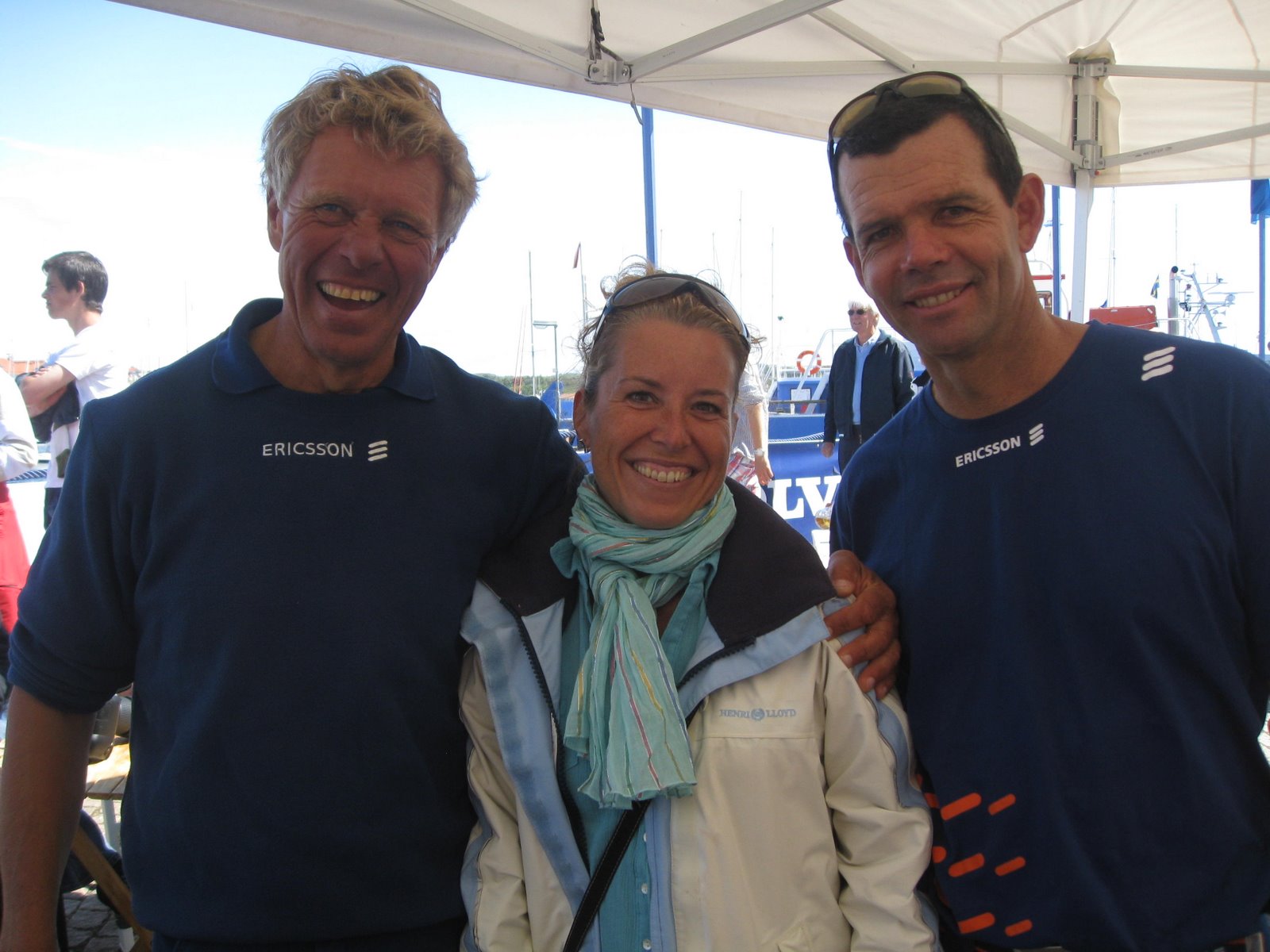 Efter en trevlig lunch på Värdshuset tog vi oss vidare för kaffe och glass på kajen. Helt plötsligt stod jag framför Mange Olsson och Torben Grael. Skepparna på Ericsson 3 respektive Ericsson 4. Det blev en pratstund på både svenska, engelska och portugisiska. Kul tyckte jag. När jag sedan kom in på caféet för att köpa kaffe sprang jag på Mange igen och han pratade glatt på och presenterade mig för Horacio Carabelli, även han på Ericsson 4. (Horacio ska tydligen komma tillbaka till Sverige om ett par månader och segla VM i Starbåt i Varberg kunde Mange berätta…)