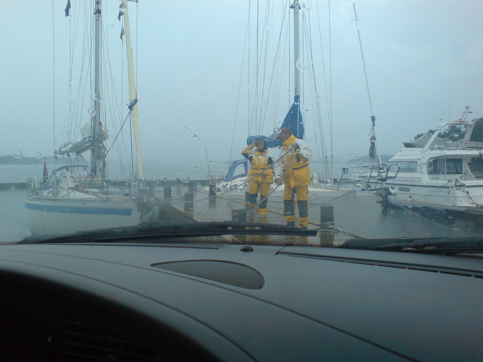 Bilden är tagen sommaren 2007 när vi ska ge oss av. Vi sitter i bilen som är fullastad med packning och kan inte ens kan börja lasta båten – det regnade alldeles för mycket. Efter 45 minuter körde vi tokracet och fällde upp biminitoppen och bara kastade in allt i båten. Sen tog själva stuvandet vid.