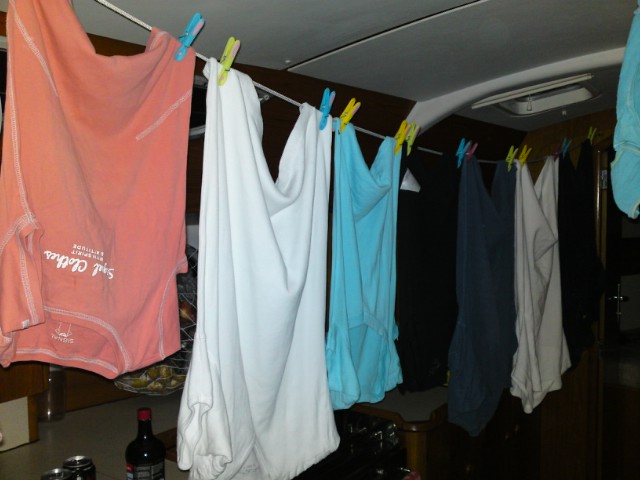 Det resulterade i att det nu hänger halvfuktig tvätt i hela båten.