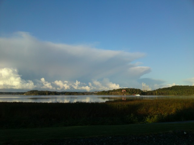 När vi sen vaknade (till doften av nybakat bröd) sken solen från en klarblå himmel och det var frost och otroligt vackert ute. Resterna från nattens åskoväder såg jag först när jag kom till jobbet. Det dröjde sig kvar över Tjörn.