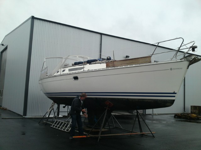 Även kompisbåten Alinde står på land. Alinde togs upp igår och det var en del botten som skulle spolas ren innan hon kund sänkas i sin vagga – som passade. Vaggan är ärvd efter Caprice – som numera finns på Ostkusten – och jag vet att skepparen på Alinde var lite nervös .