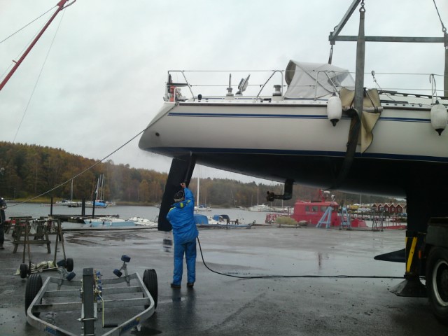 I torsdags, i strålande vackert höstväder, körde maken ner båten till Wallhamn där den STORA lastbilen lyfte upp Aquelina ur vattnet, körde henne till platsen hon ska stå på och lyfte sedan ner henne till de stöttor hon ska stå på. Nu kommer hon få vila i några månader innan det blir dags att börja greja inför nästa säsong.