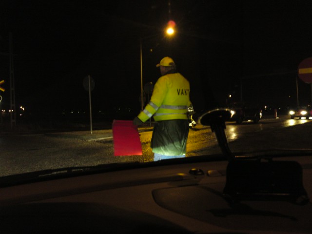 Han stod där när jag åkte till jobbet, när jag åkte hem på lunchen och när jag skulle hem efter jobbet. Med samma röda flagga och klädd i samma neongula kläder. Jag hoppas verkligen att de är vattentäta för det har regnat hela dagen idag. Jag skulle inte vilja byta honom.