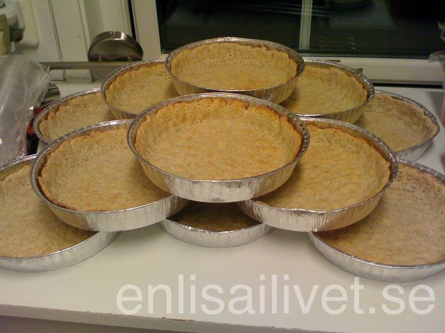 Receptet var busenkelt. 75 g smör, 1/2 dl grahamsmjöl, 2 dl vetemjöl och 3/4 dl kesella. Imorgon ska de fyllas och min tanke är att grädda pajerna i takt med att de ska ätas. Det ska bli lite annat också men det fixar vi imorgon. Vi är ju många som kan hjälpas åt.