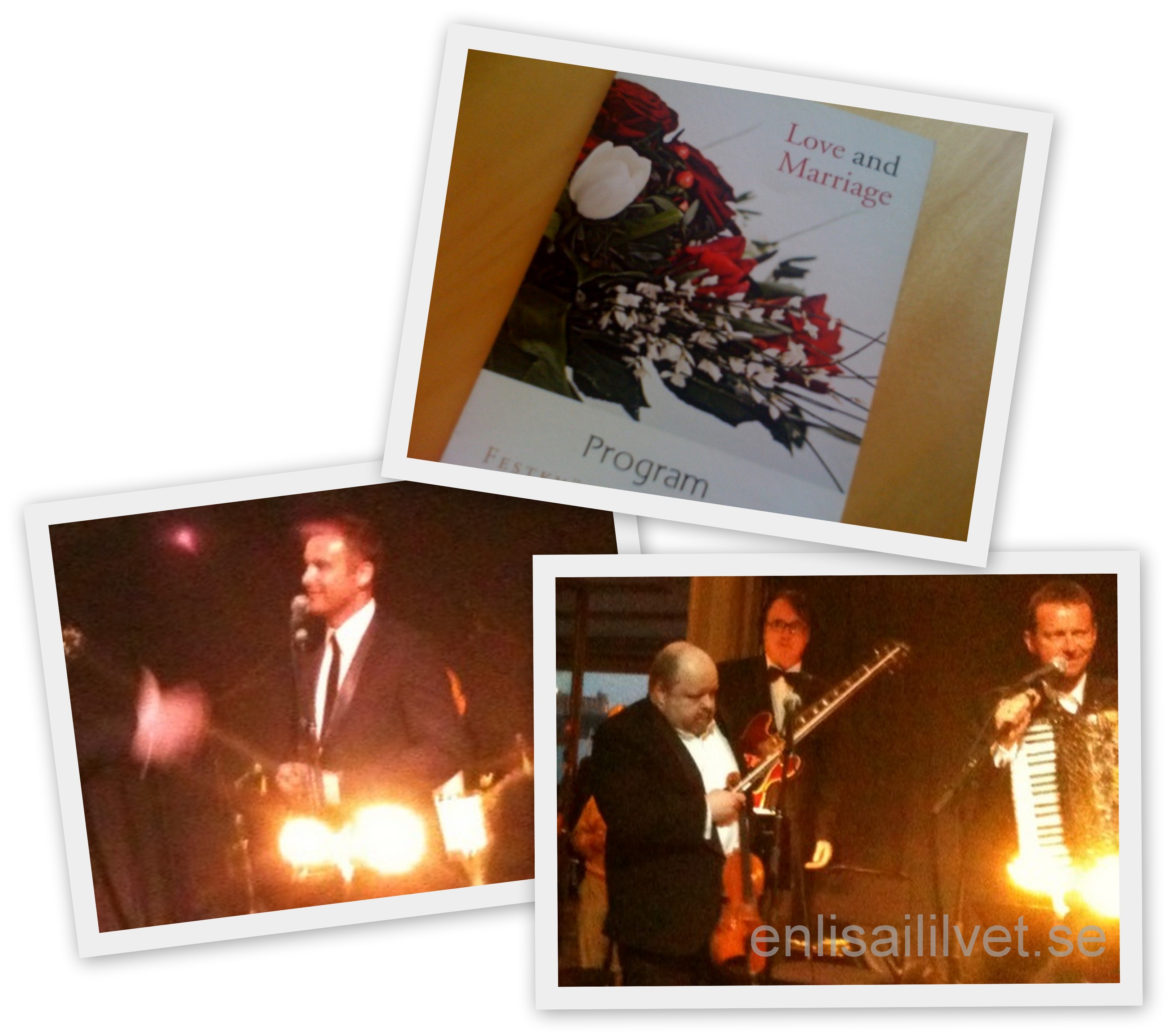 Vilken föreställning det var och vilken god mat vi bjöds på efter det. Minipajer, Blomkålssoppa med tryffel, ostron, skaldjusbakelser och pilgrimsmusslor. Under tiden vi minglade runt och åt och drack spelade ett ”band” för oss i foajén. Helt plötsligt stod David Shannon där och sjöng och det dröjde inte länge innan Kalle Moraeus och Bengan Janson var där också. Och visst sjöng Kalle även sin låt från melodifestivalen. (Pratade med Kalle efteråt och jag skulle hälsa till dig svägerskan).