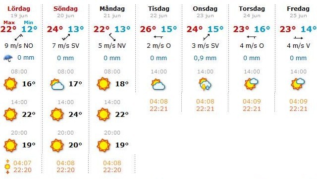 Ändå kan jag inte låta bli att redan nu börja hålla koll på hur vädret blir midsommarveckan. Just nu gillar jag vad jag ser…