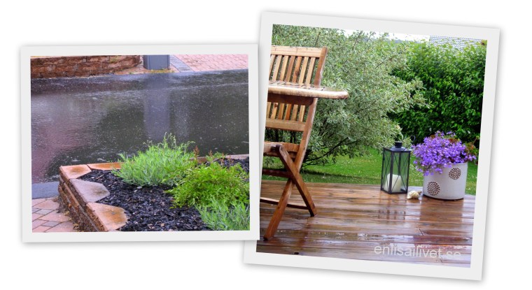 Vaknade tidigt idag och tyckte att det lät konstigt i huset. Något liksom rann och droppade. Läckan i taket? Nej – ett helt vanligt sommarregn 🙂