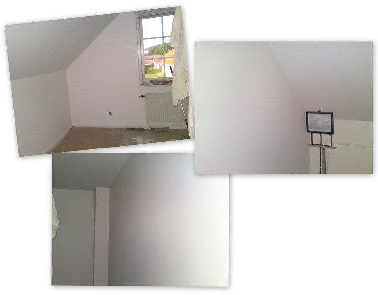 Att måla ett rum vitt kan låta enkelt men vitt är just vitt. Vitt täcker inte sådär jättebra direkt och jag insåg medan jag målade lager två att det skulle krävas även ett lager tre innan det blev bra. Eller i alla fall så bra det kunde bli. Problemet var bara tiden. Hur skulle jag hinna? Maken och jag har ju hela tiden sagt att vi ska ställa in möblerna på onsdagen och nu var det redan tisdag kväll.
