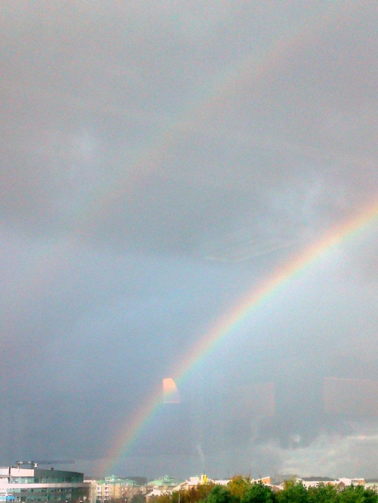 Om det är dubbla regnbågar, innebär det då att det finns dubbla skatter vid regnbågens slut också? Dagen bjöd förutom på regn och hagel även på dessa två regnbågar. Visste du förresten att regnbågen egentligen är en cirkel? Det fick jag se första gången när jag bodde i Brasilien och var och tittade på Iguaçufallen och blev mycket fascinerad av.