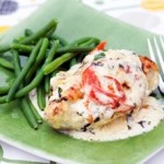 Sätt ugnen på 200 grader. Putsa 4 kycklingfiléer och banka ut dem försiktigt om de är ojämna. Stek i smör så att de får en fin yta- Skiva 2 tomater tunt.