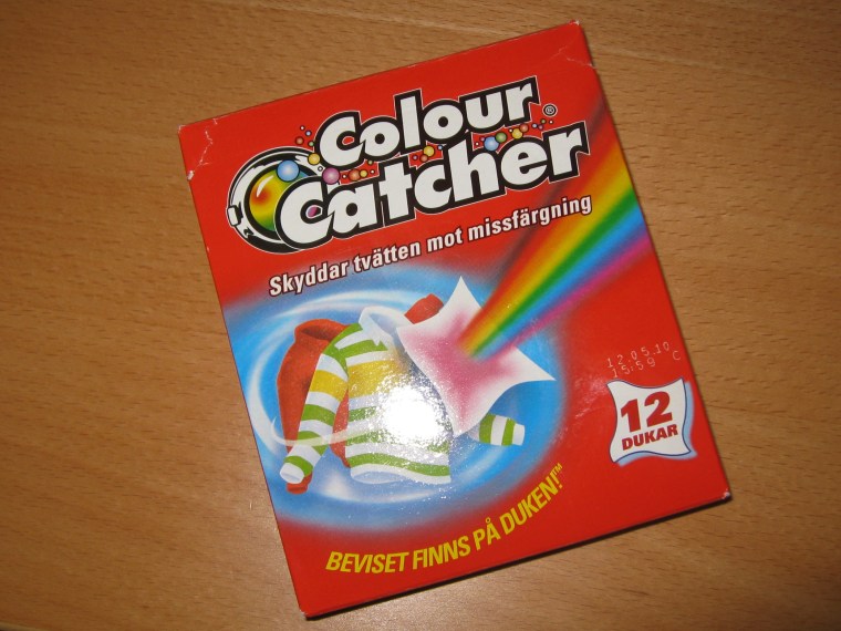 Colour Catcher heter produkten. Man lägger bara en duk tillsammans med tvätten och låter den gå med i maskinen. Duken suger åt sig överskottsfärgen och kragen förblir vit.