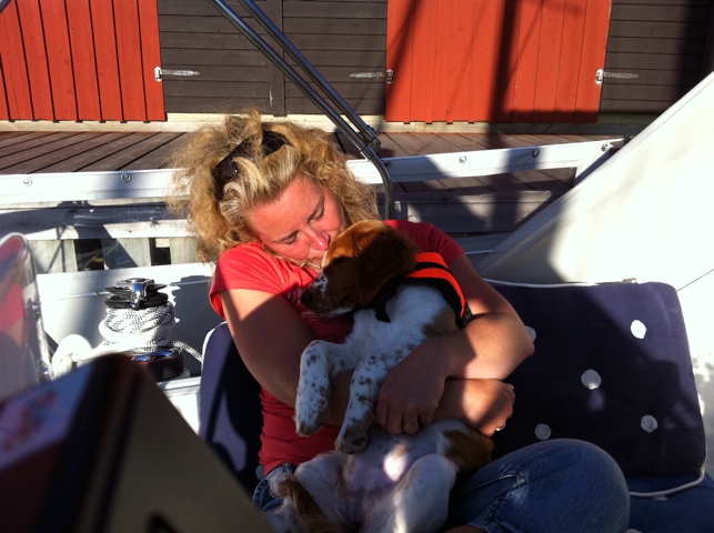 Plötsligt skuttade hon av någon anledning ut i vattnet och kom på sig själv med att ha vatten till maxhöjd ungefär. Hon sköt rygg som en katt och visste inte var hon skulle göra av den ena framtassen som var ovanför vattnet. Behöver jag säga att hon såg förvånad ut? Till slut rusade hon upp på stranden och började gräva i sanden istället. Något som fick husse att lyfta upp henne för att skölja av henne i havet igen innan vi gick tillbaka till båten igen. Som om inte det räckte spolade matte sen av henne med sötvatten…