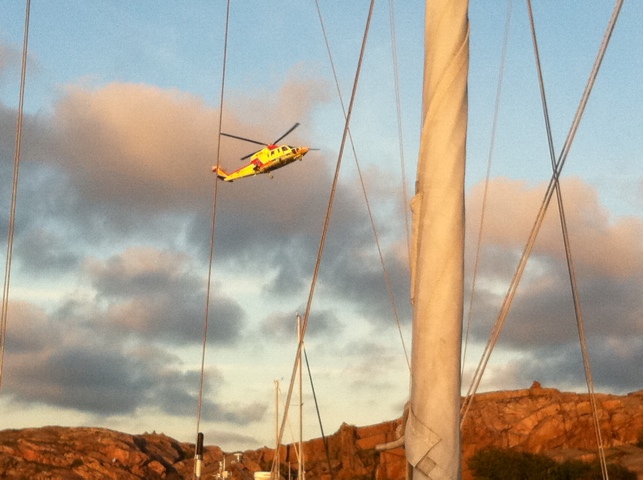 Den skulle landa här. Vi hade inte ens märkt att någon skadat sig men då kunde vi konstatera att någon låg på klipporna bakom oss. Helikoptern gick in för landning och även Sjöräddningen anslöt.