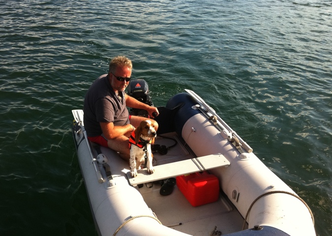 Det här med att ligga på svaj har vi alltid gillat bäst och vi har funderat lite kring hur det skulle funka med Sintra ombord. Nu funderar vi inte längre. Sintra älskar att åka gummibåt och hoppar kaxigt både i och ur den när det är dags. Skönt tycker vi och fortsätter ankra på svaj.