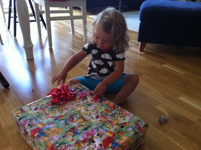 Medan vi hör att det både åskar och regnar hemma har vi istället sol och 25 grader varmt. Det är riktig högsommarväder och vi sitter på altanen i väntan på att kalaset ska börja. Födelsedagsbarnet passar klokt nog på att sova en liten stund. Klokt tror jag.