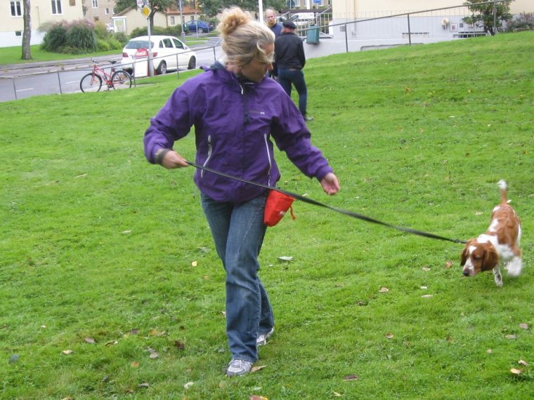 Det blev hanteringsövningen. Dvs trä på henne en tröja och ta på henne sockar. Just hantering är något som hon varit van vid ända sedan hon kom till oss. Det har varit bilsele och flytväst på, och i perioder flera gånger om dagen. Alltså inget hon överhuvudtaget bryr sig om. Hon bryr sig så lite om det att hon inte ens ville ha belöning utan till och med spottade ut den. Rätt examensövning till rätt hund. Tänk om hon hade fått ”gå fint i koppel”. Det hade inte alls blivit lika bra 🙂 Det måste vi träna mycket mera på.