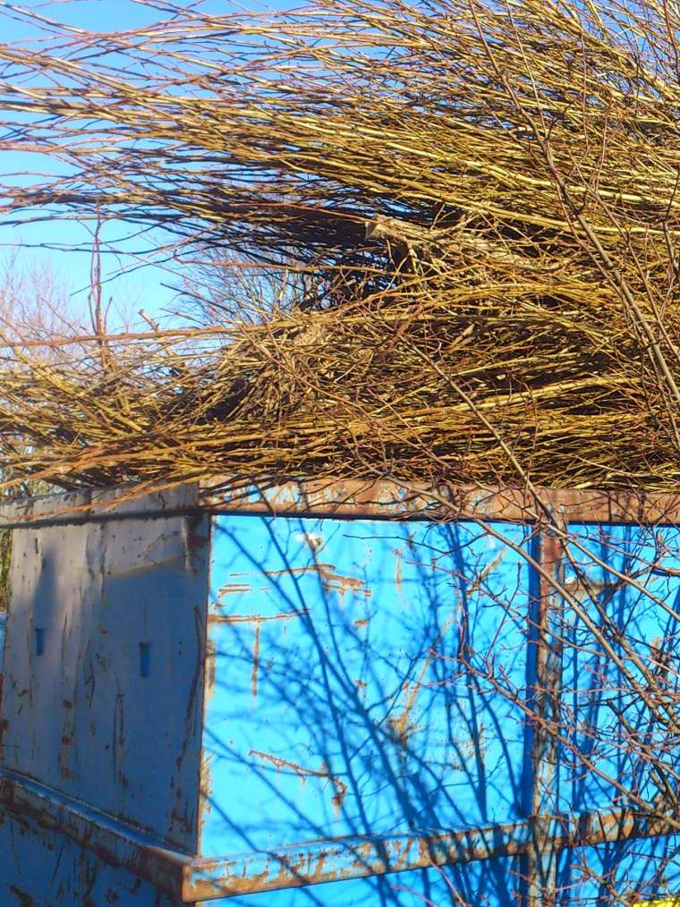 Hur många tömningar det blev? Inga, förutom den ordinarie hämtningen. De har hoppat, knutit och surrat innehållet i containern och allt fick plats. Hoppas nu bara att surrningen håller även för hämtningen.