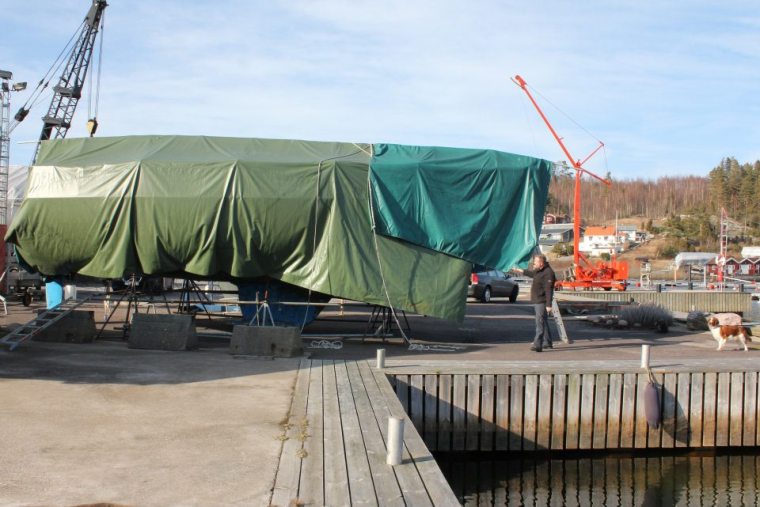 Med det väder som är nu fanns det liksom ingen återvändo. Termometern kröp längre och längre upp och stannade runt nio grader och vi satte oss i bilarna och körde till Almösund där vi har båten uppställd på vintern. Nu skulle presenningen av. En stor och två lite mindre täcker Aquelina och skyddar henne från väder och vind under de mörkare årstiderna. Den här vintern har de verkligen fått bekänna färg med tanke på alla stormar vi har haft. Men – det har funkat hur bra som helst.