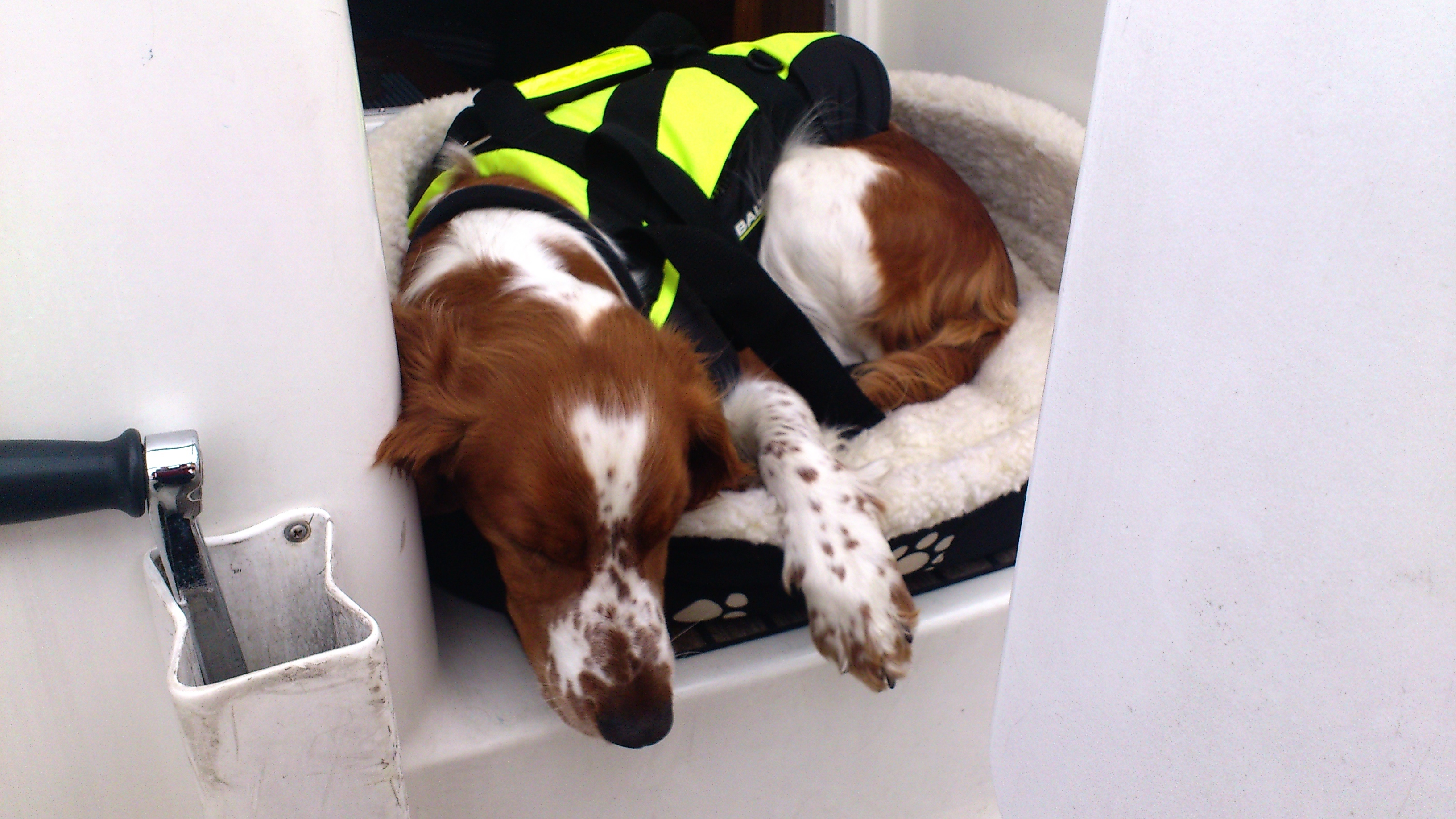 Det var inte direkt varmt och vi klädde på oss ordentligt. Sintra fann sig väl tillrätta i sin bädd som vi ställde vid nedgången till ruffen. Bästa platsen i hela sittbrunnen och nu ska HON konkurrera med mig om den platsen… Hm…