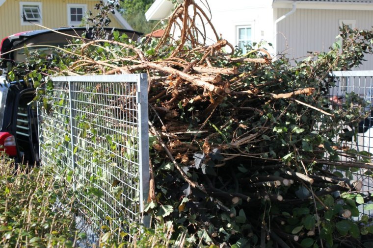Den har inte riktigt stått överst på priolistan vår trädgård. Grön är den och det växer som ogräs i den. Ja, mycket är nog ogräs också… I våras började vi med buskarna på baksidan och tidigare i veckan tog vi oss an framsidan och de buskar som hade fått växa obehindrat där. Idag var det dags för resten. ”Resten” består av två häggmisplar, tre smällspireor, två krypenar, två brudspireor och lite annat smått och gott.