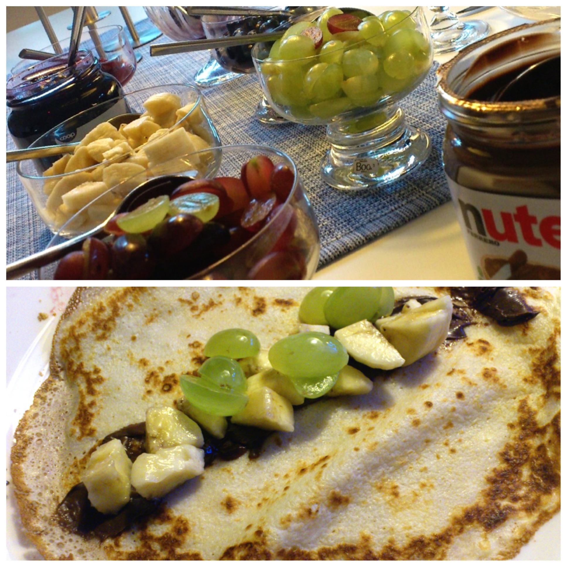 Pannkakor står inte överst på min favvolista på mat men idag blev jag ruggigt sugen på det. Yngsta dottern hängde på och skar upp frukt och dukade fram Nutella. Själv var jag nog lite tveksam till just Nutella men bara tills jag hade smakat. Rackarns gott var det. Speciellt med bananer och vindruvor till.