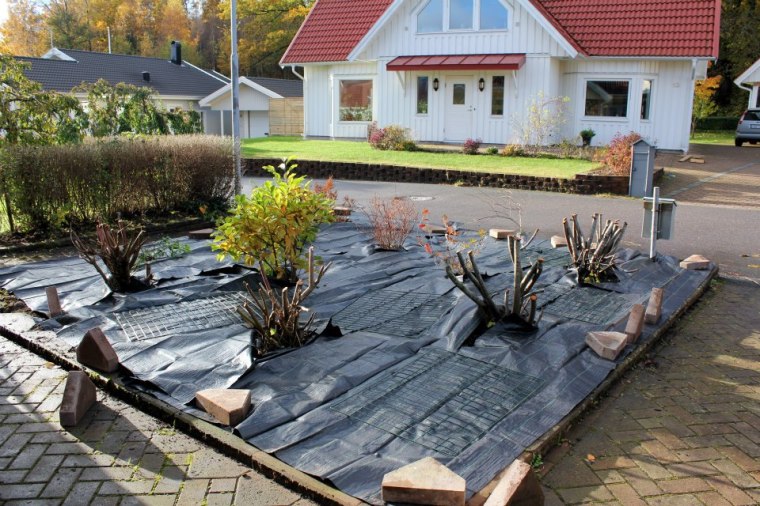 Vi bestämde oss för att helgens väder var riktigt trädgårdsarbetarväder och gjorde ett ryck med framsidans plantering. Vintergrönan (marktäckaren) skulle bort och allt skulle täckas med markduk inför att vi sedan kommer att lägga på kullersten.