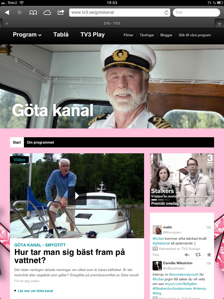 Premiär om en liten stund på TV3’s nya program Göta Kanal. Förväntan på kvaliteten på programmet är låg och jag misstänker att fokus kommer att ligga på de yttersta ytterligheterna mellan segel- och motorbåtsfolk. Åtminstone är det vad trailern har visat på. Dock hoppas jag på många skratt.