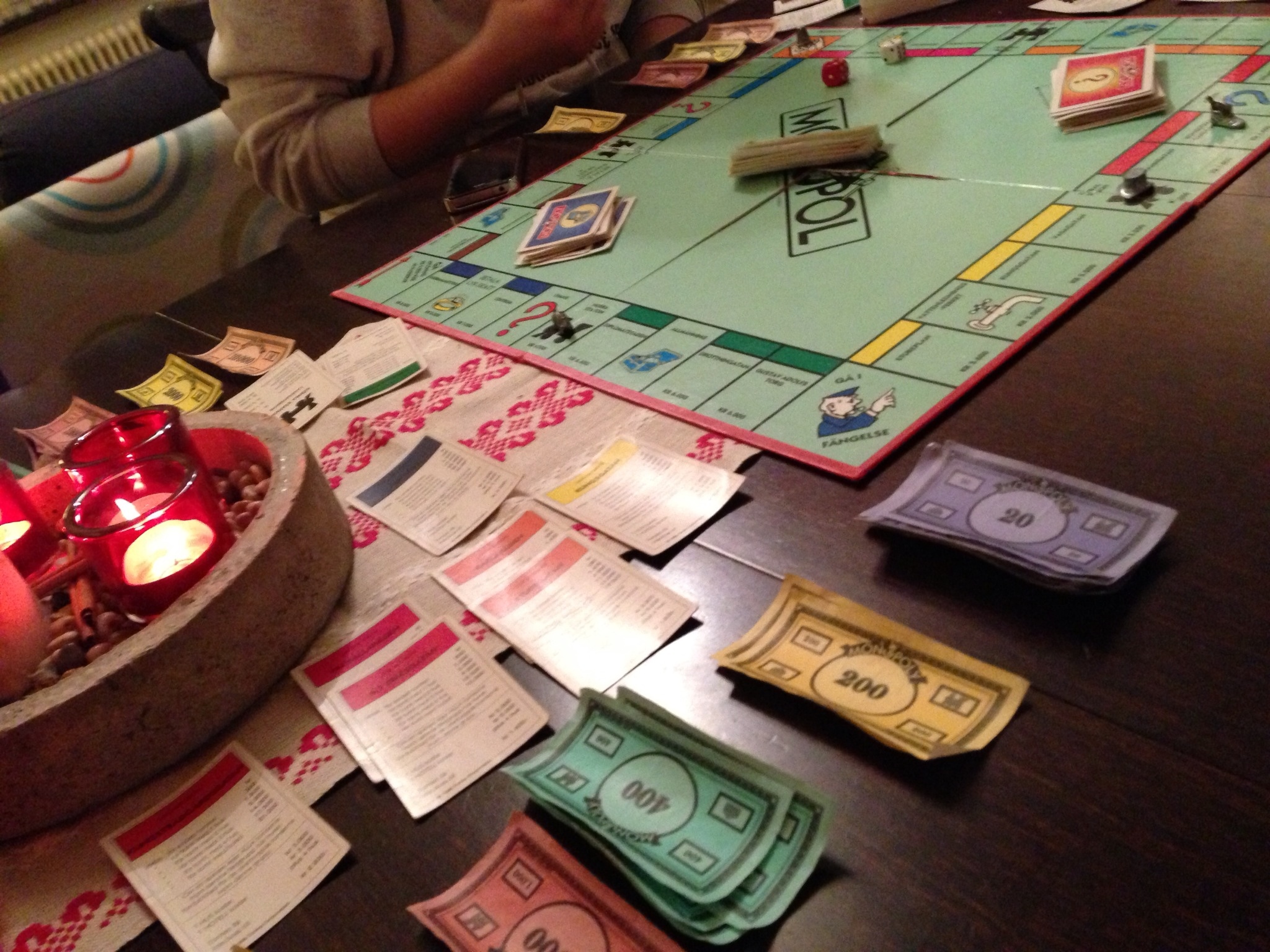 Hela dagen tjatade hon om att vi skulle spela. Helst innan middagen redan. Vi lyckades hålla emot till efter middagsdisken, som hon fö tog hand om men sedan gick det inte att hålla emot längre. Monopol-spelet åkte fram.