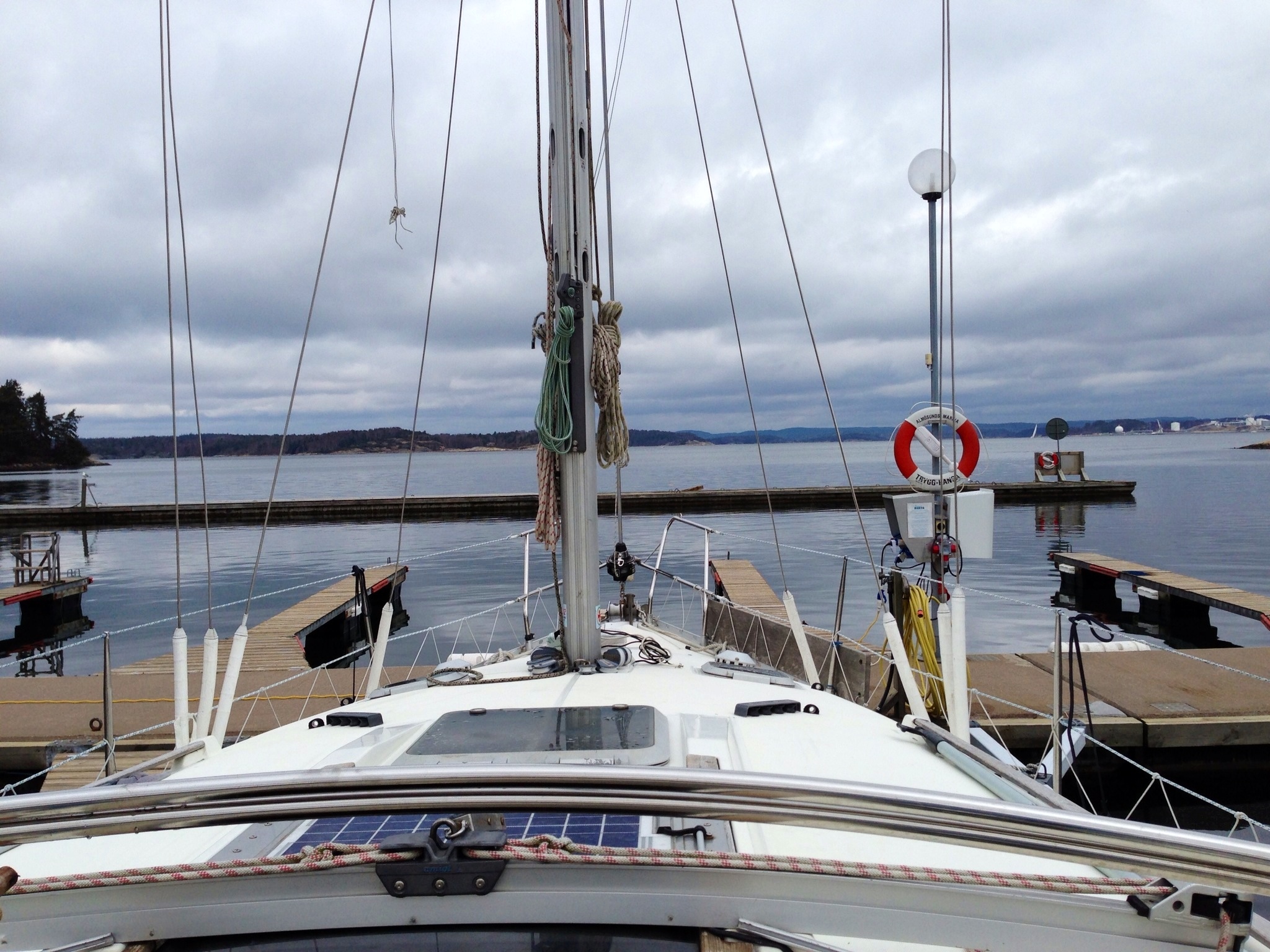 Bara för att båten är i sjön innebär inte det att ALLT är klart. Riggen ska trimmas, seglen ska på, sprayhoodet och biminitoppen ska monteras och det ska röjas och städas inne i båten innan vi kan flytta in dynor och allt annat som har bott i garaget i vinter. I höstas passade vi även på att tömma båten på allt så det är en hel del som ska bäras ombord igen.