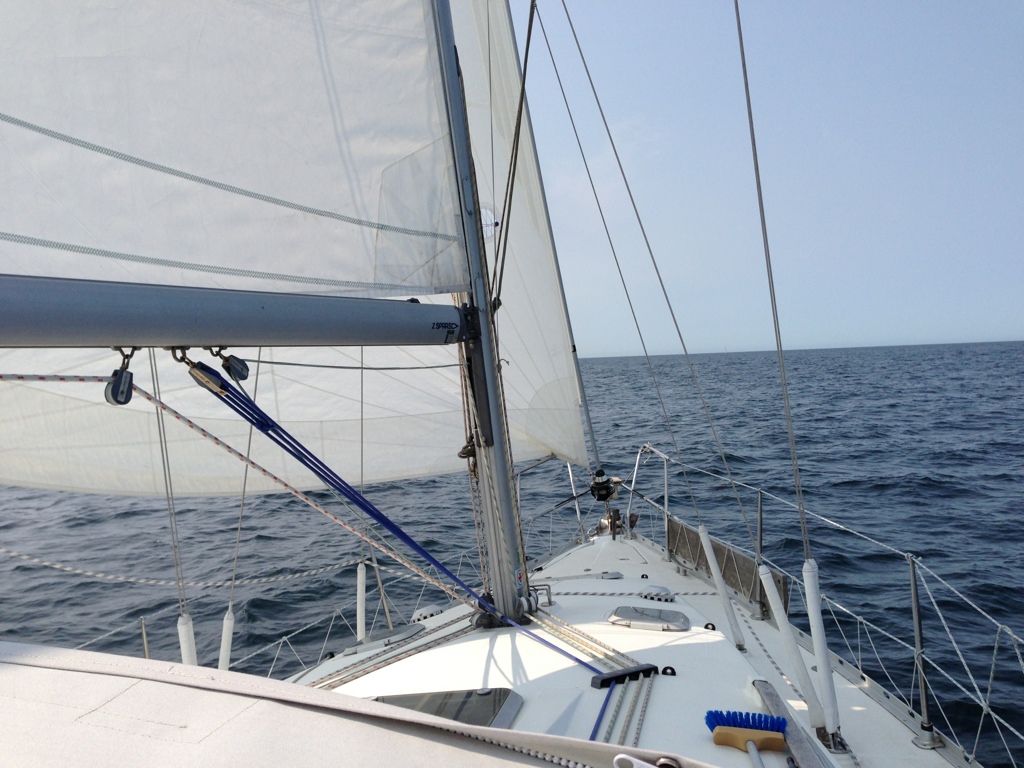Prognosen lovade 5-8 m/s från nordväst och vi hoppades att den skulle stämma vilket den också gjorde. Det hade blåst under natten så det blev en del vågor ute på havet ett tag men överlag var det superfin segling. Maken log från öra till öra mest hela tiden. Sintra valde låg tyngdpunkt och låg mest och sov under seglingen.