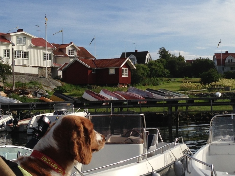 Lite kul – när bryggan väl hade fyllts på blev vi åtta båtar. I fem av båtarna är det hundar… Sintra har haft fullt upp idag.