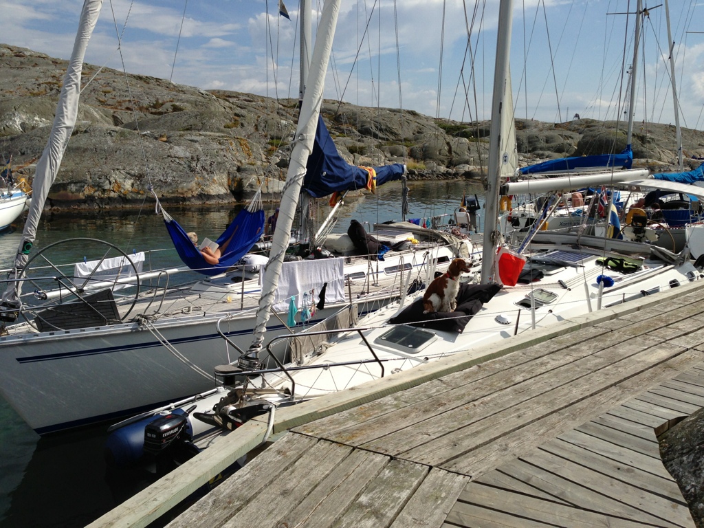 När vi närmade oss ön såg vi flera båtar som lämnade och lite började vi då att hoppas. Hoppas på att få en plats vid bryggan. Med tanke på att det bara är sex, sju båtar som kan få de hoppades vi nog egentligen inte så mycket så döm om vår förvåning när det var ledigt och vi kunde lägga till.