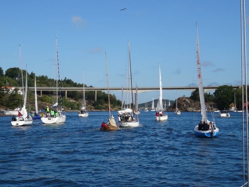 På väg ut till startområdet vid Skåpesund var det stundtals trångt med kryssande båtar och jag har nog aldrig sett så många båtar samtidigt under Skåpesundsbron. Den lilla träbåten i mitten av bilden nedan stod vid dagens slut som totalsegrare av den korta banan men utan bogseringshjälpen är ju frågan om de hade hunnit till start 🙂
