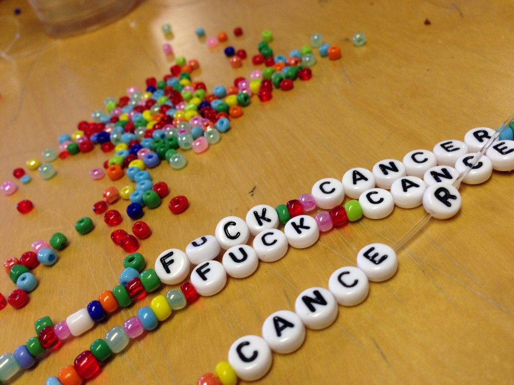 Redan på lördagen hade vi bestämt oss för att pärla armband dagen efter. Vi hade nämligen fått reda på att Ung Cancer hade öppet hus och att man kunde komma dit och pärla armband som de sedan säljer. Vi var där i en och en halv timma och jag tror att vi bidrog med femtio stycken. Lite pilliga var det och att prata under tiden var bara att glömma. 19 pärlor, FUCK, tre pärlor, CANCER, 19 pärlor till. Färgerna skulle dessutom vara helt slumpade. Jag vet nu att alla som var där idag tillsammans pärlade 2050 armband. Jag kommer helt klart göra det fler gånger.