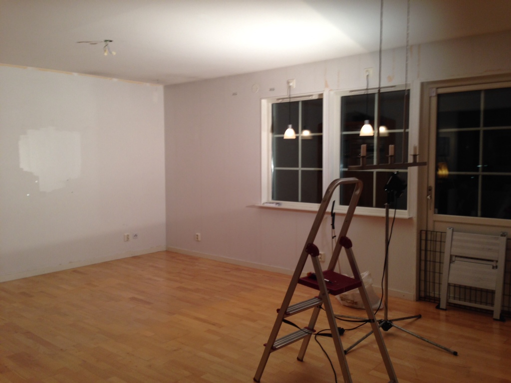 Vi hade tapetserat ett rum på övervåningen och jag fick lite inspiration att fixa en fondvägg i vardagsrummet. När väl den var klar insåg vi att vi borde måla både tak och väggar också. Fortsätta med tapeten på fönsterväggen ville jag också.