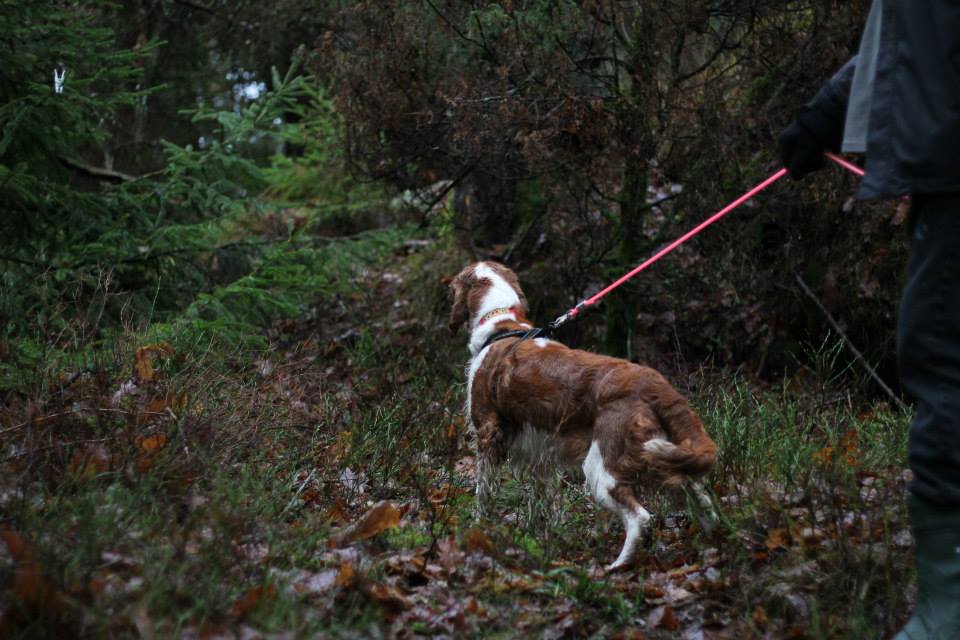Maken och Sintras bror Rufus husse åkte till skogen lite tidigare för att lägga blodspår. En timme senare anslöt vi andra och det var två förväntansfulla hundar som anade att dagens skogspromenad skulle bli lite mer spännande än de brukar. Regnet hängde i luften men det var inget som störde luktsinnet det minsta på hundarna. Båda har ju testat en gång tidigare men i och med att det var första gången som vi gjorde det själva blev det korta spår som nog egentligen var i kortaste laget. Men vad gör väl det? Huvudsaken är ju att de tycker att det är kul.