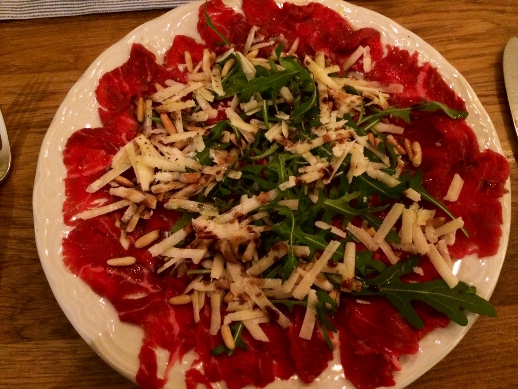 Tunt skivad oxfilé, parmesan, ruccola och pinjenötter. Några varv med pepparkvarnen, flingsalt, olivolja och lite balsamvinäger. Sååå gott och sååå länge sedan sist. Allt för länge sedan.