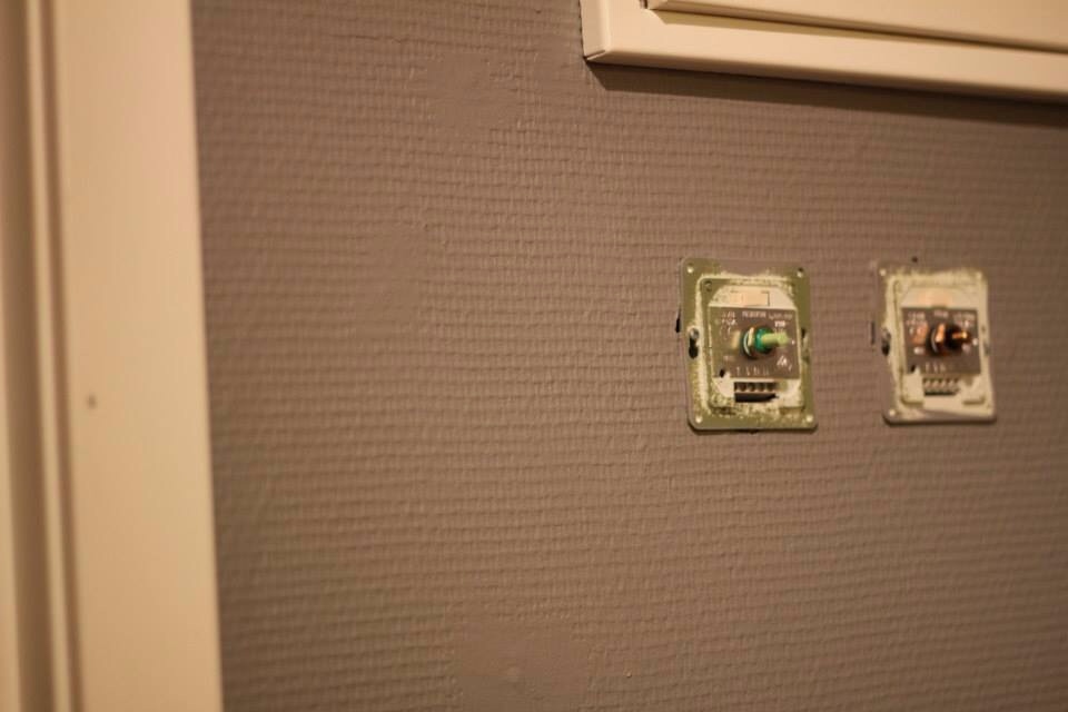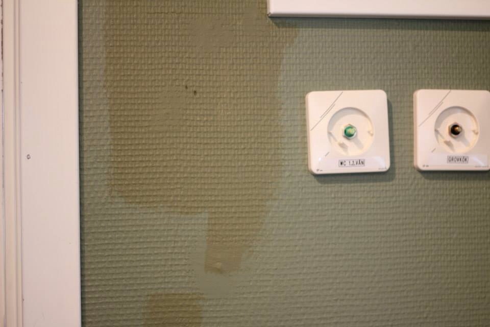 När vi bytte larm fick vi plocka bort en del displayer kablage i tvättstugehallen. Maken gjorde ett tappert försök med att bättringsmåla där de suttit men den färg hallen var målad med hade utgått och försöket att hitta rätt nyans gick väl sådär…