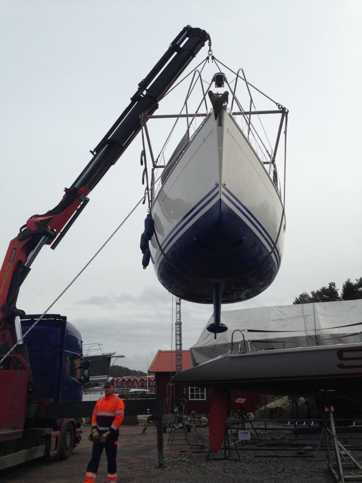 Aquelina hängande i kranen på lastbilen. Det där momentet som jag tycker är allra pirrigast. Det är så självklart vad som händer om många ton båt ramlar i marken…