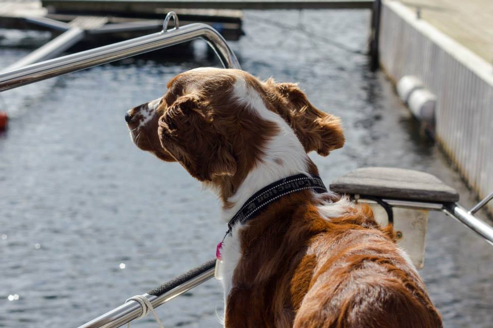 Båten är sjösatt och vi har flyttat den till en tillfällig plats i väntan på vår nya plats som inte är klar än. Sintra, båtvan som hon är, skuttar fram och ställer sig i fören, liksom för att hålla ”uppsikt”. Där har hon stått länge, med öronen fladdrande i vinden. Verkar som om hon vill hålla koll på det mesta.