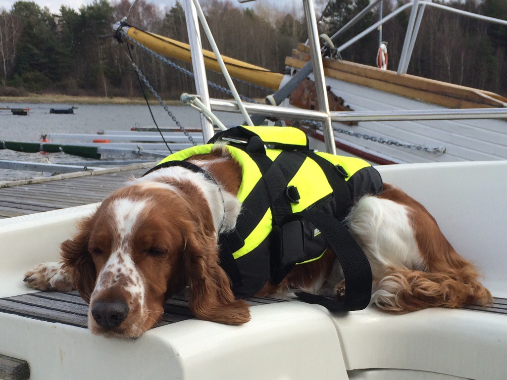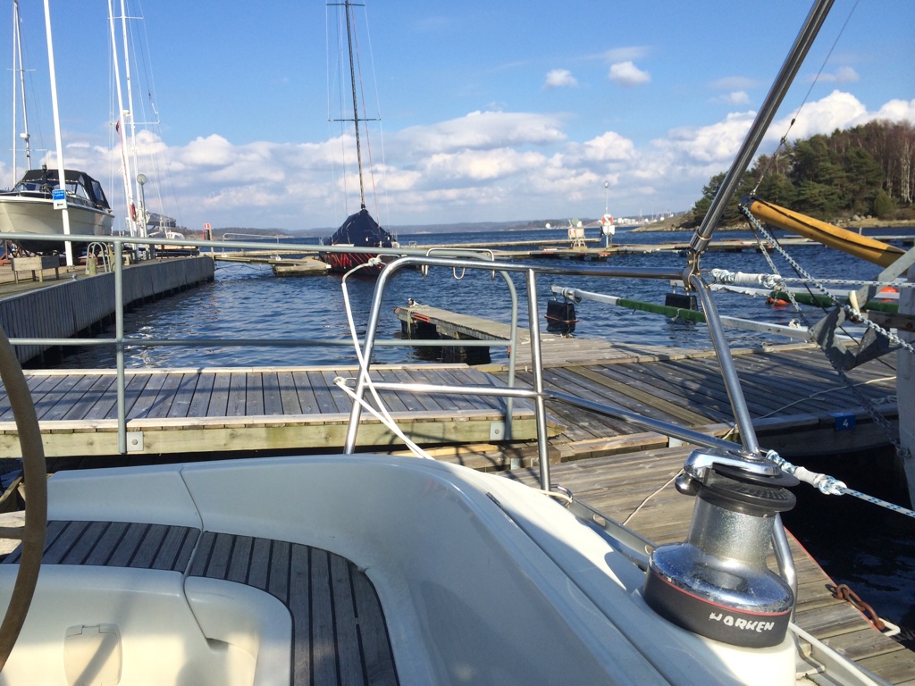 Vad gör det väl om det blåser lite kallt? Solen skiner och båten är sjösatt. Med sprayhooden som skydd är det lä i sittbrunnen och nere i båten går värmaren. Det fortsatta arbetet med att få Aquelina klar rullar på och vi får massor gjort. Tänk sedan vad gott den där första koppen kaffe i sittbrunnen smakade.