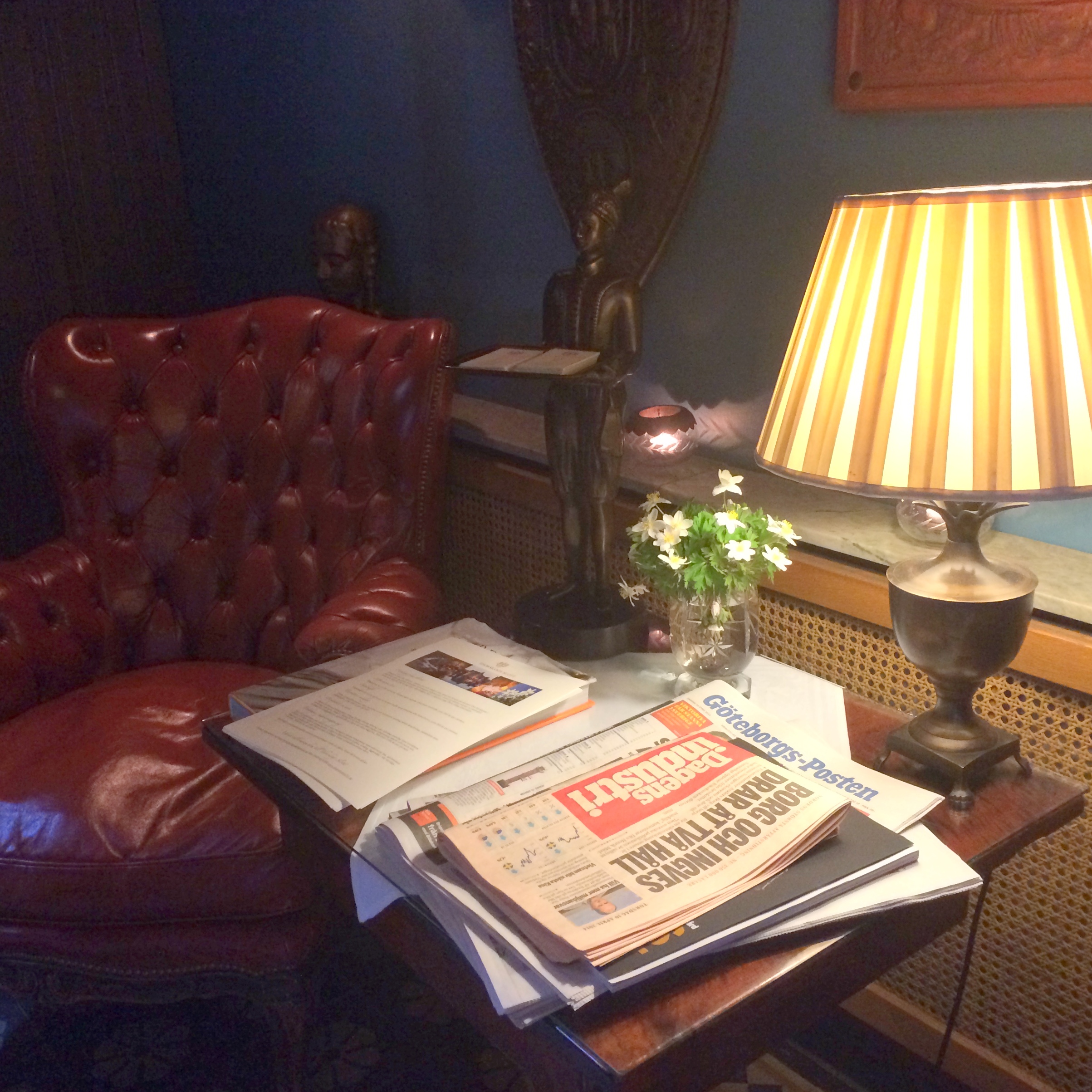 Inne på Thorskogs slott, under trappan, finns en sittgrupp. Två mjuka skinnfåtöljer, en läslampa och en hög med lektyr. Platsen var verkligen ”inbjudande” men den här gången hade jag inte tid att sätta mig ner och njuta. Kanske nästa gång 🙂