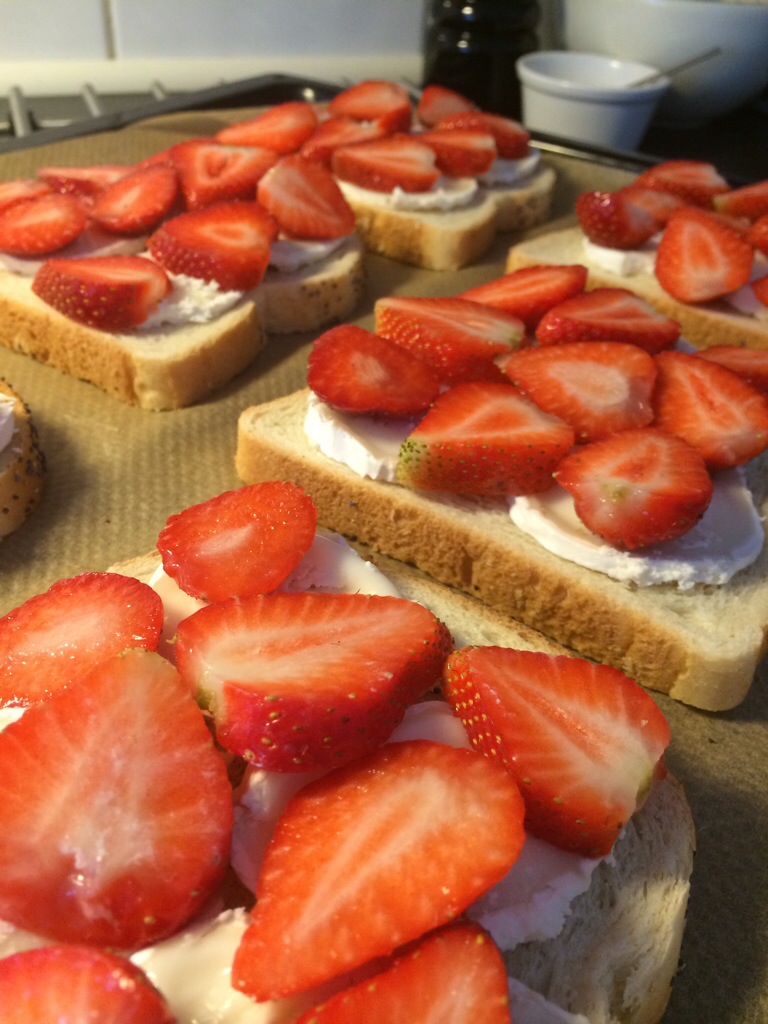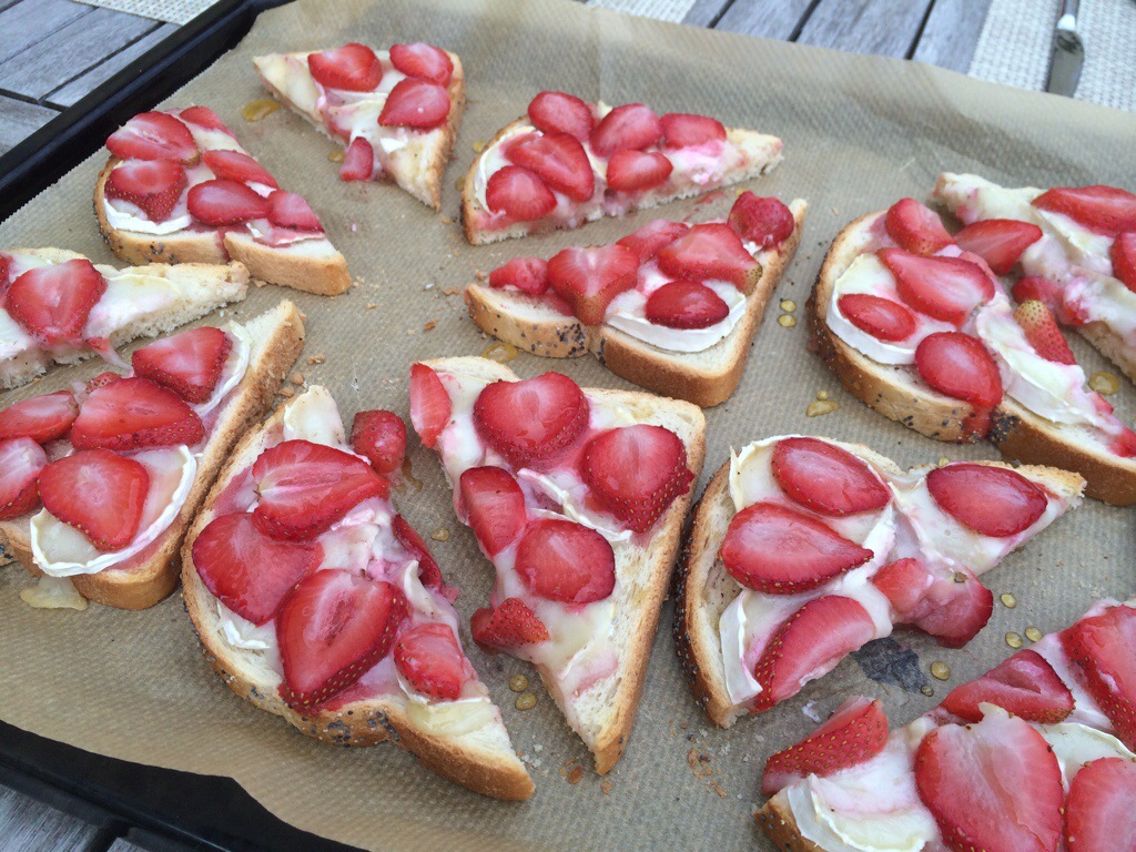 Smöra bröd och pudra kanel på. Lägg på tunna skivor med chèvre och skivade jordgubbar. Skicka in i ugnen och ringla honung över dem när de är ”lagom” färdiga.