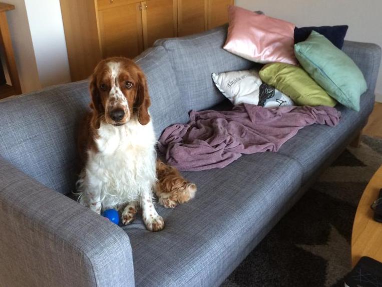 Kanske lite busigare än vanligt för när jag kom hem efter att ha varit iväg en sväng hade hon rumsterat om ordentligt i soffan – eller – var det verkligen hon? För visst ser hon väldigt oskyldig ut 🙂 Ända ut i den blåa bollen….