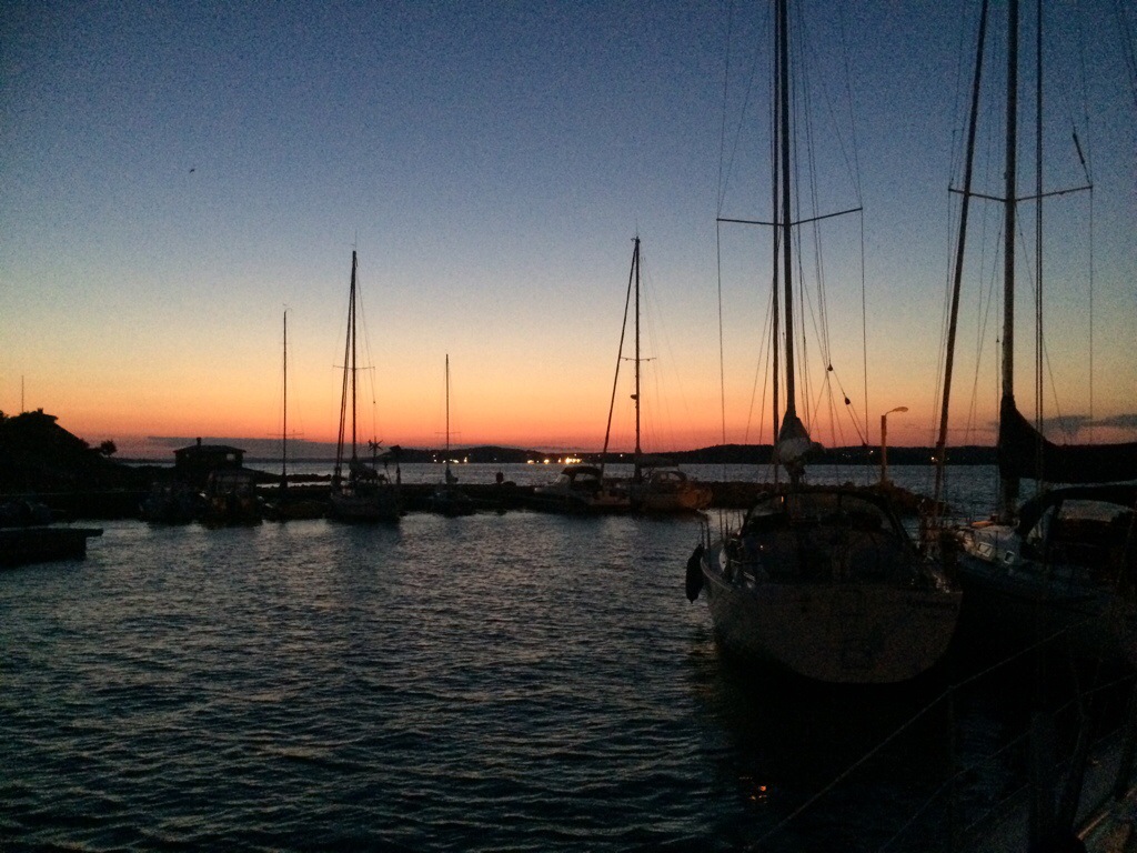 Istället för att njuta av denljumna kvällen sjöstuvade vi båten (så att inget kan åka runt när det gungar) för en tidig avfärd som idag.